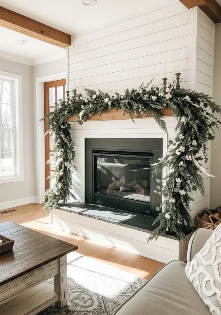 This bright and cozy living room features a shiplap fireplace framed by a natural wood mantle and soft frosted garland. The greenery drapes gracefully along the sides, accented by white berries and touches of eucalyptus for a fresh, airy look. Simple brass candlesticks add just the right amount of elegance without overwhelming the calm neutral tones of the space.