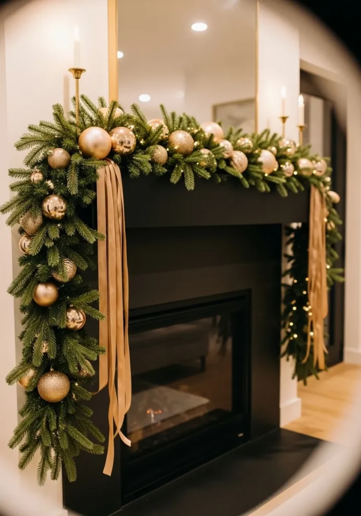 This bold black fireplace becomes the star of the room with its lush garland of deep green pine and gleaming gold ornaments. Long champagne ribbons cascade down the sides while brass candlesticks add a hint of old-world luxury. The glow of the lights bouncing off the metallic finishes creates a magical festive shine.