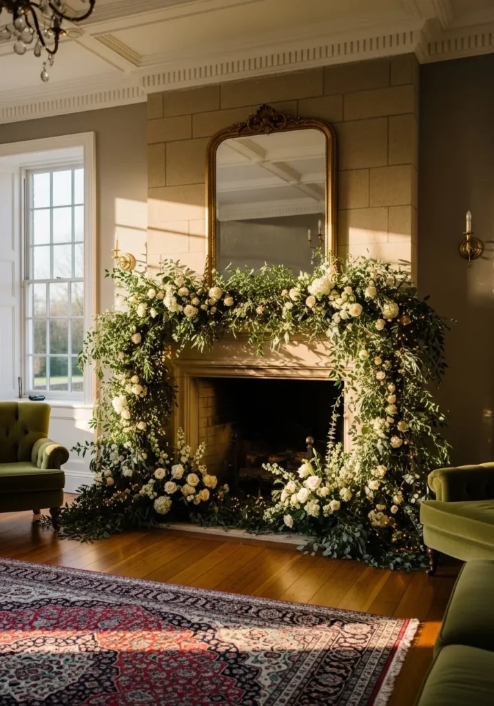 This stunning fireplace design looks like it was kissed by a winter garden. Layers of eucalyptus, pine, and ivory blooms frame the mantle and spill gracefully to the floor. The natural greenery paired with the golden mirror above creates a breathtaking balance of softness and grandeur.