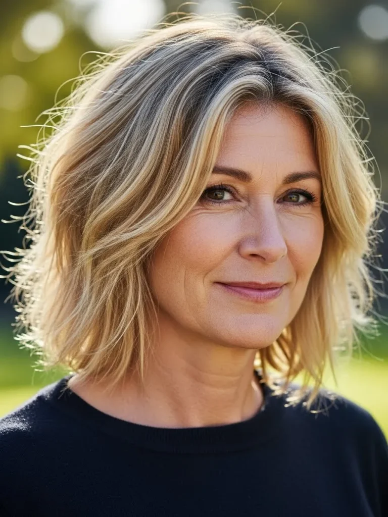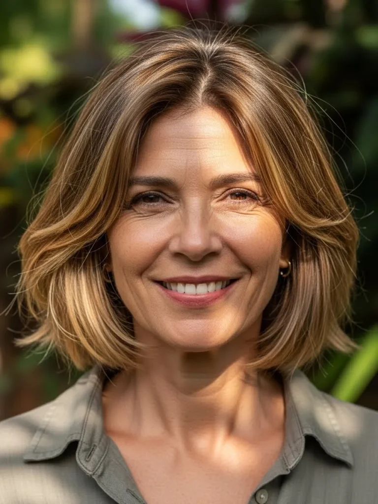 This sun kissed bob lands around the collarbone and has loose lived in layers that bring a touch of playful texture. The blonde highlights brighten the whole look and give it that warm outdoorsy glow. The layers create gentle movement around the ends which keeps the style soft and relaxed.