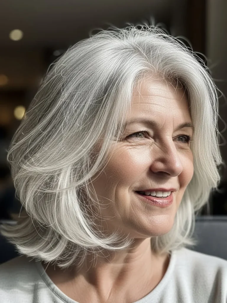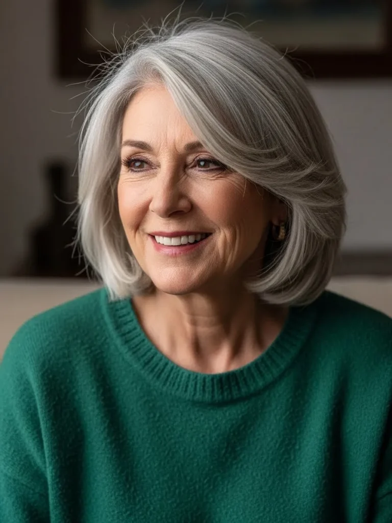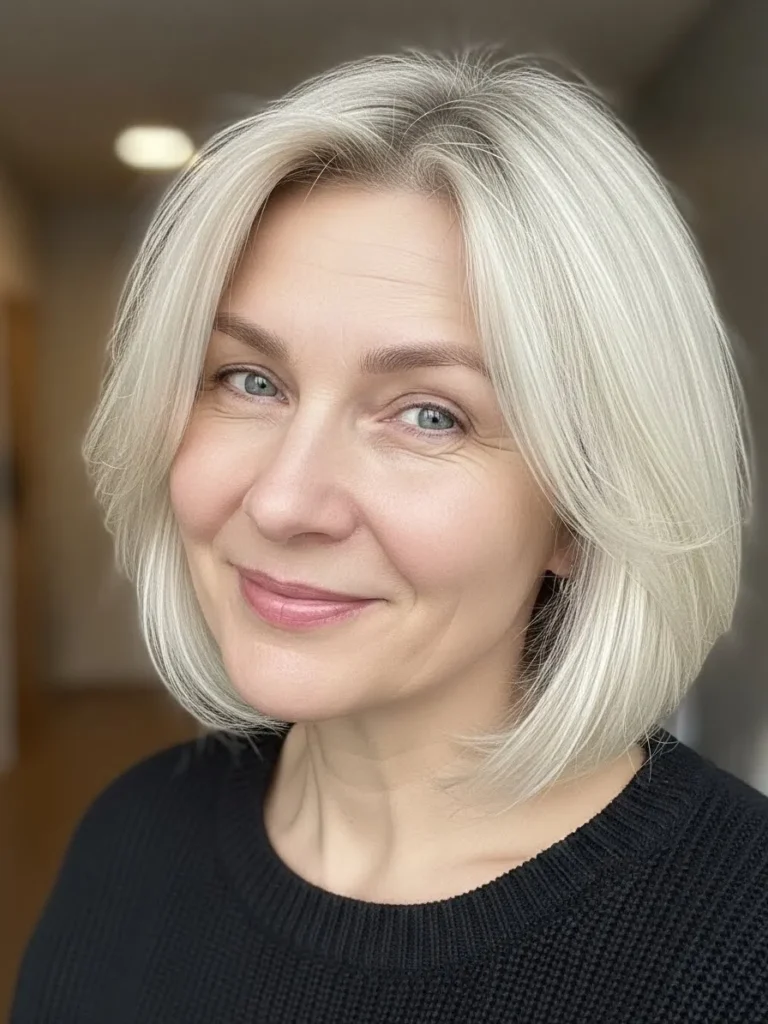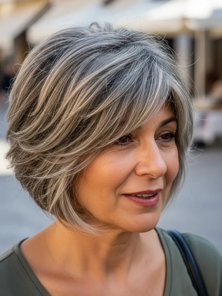 Every time I see a layered silver bob like this I think about how effortlessly elegant it feels. The volume gives me a little boost of confidence and the color looks stunning in natural light. It is a polished style that still feels completely approachable.