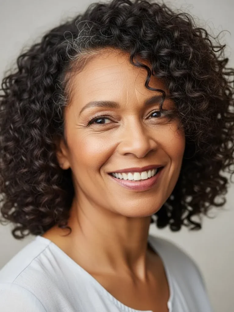 This curly bob sits right at the chin with springy, well defined curls that give the whole style lush volume. The natural dark tone looks rich and healthy and the light layering helps the curls fall in a balanced rounded shape. Little hints of silver at the root add a touch of character that feels beautifully authentic.