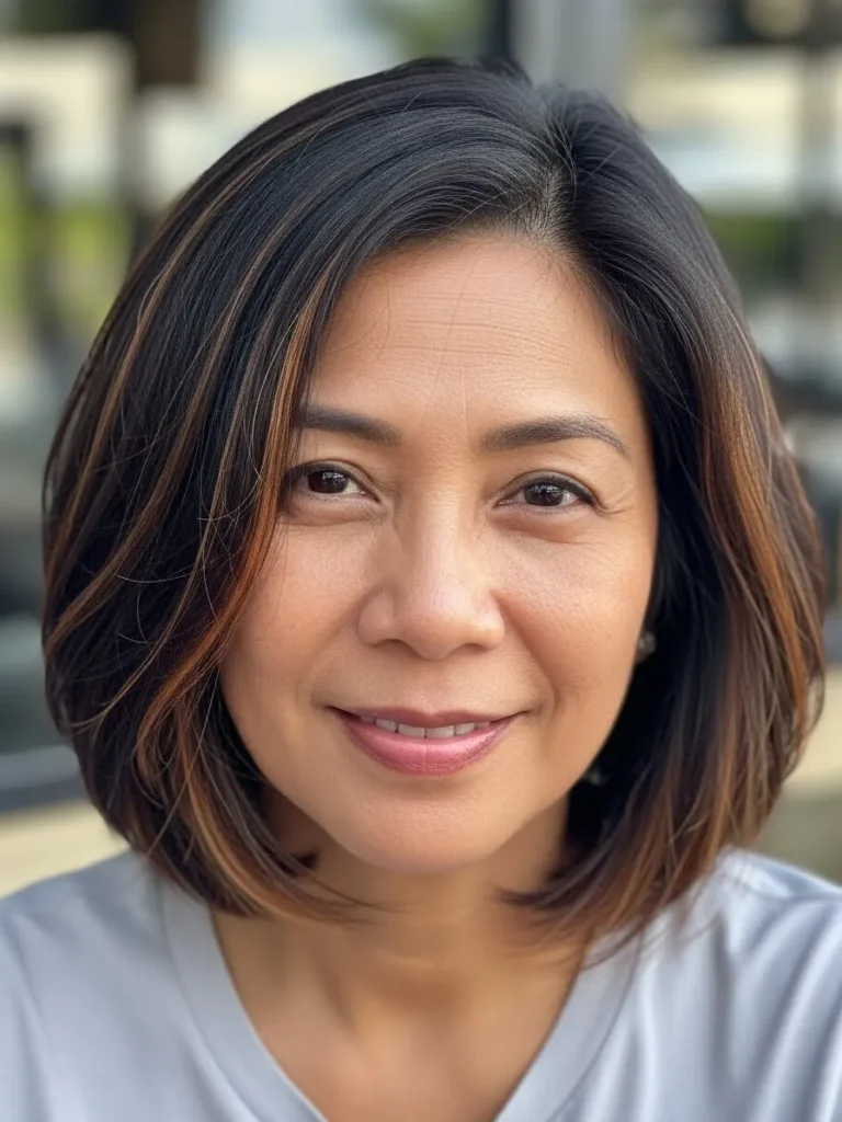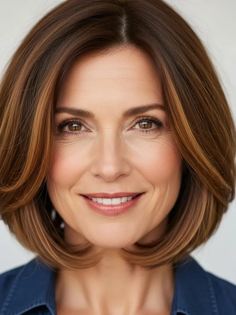 This bob blends deep chocolate tones with soft caramel highlights that frame the face. The layers are subtle yet perfectly placed to give the style gentle lift. The ends curve inward which creates a flattering contour around the cheeks and jawline.