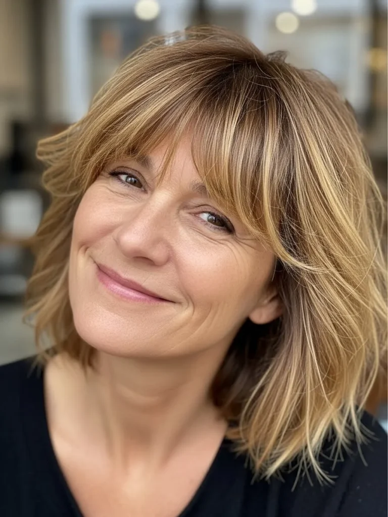 A relaxed textured bob always feels fun for me. The fringe softens my face while the color gives my hair that sunny glow I adore. It is an easygoing style that still looks polished enough for anything on my schedule.
