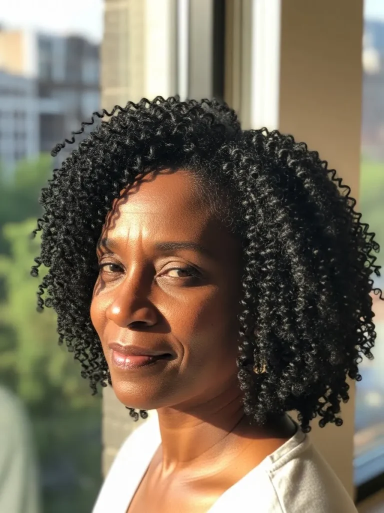 This curly bob falls at chin level with beautifully defined coils that create natural volume. The layers help the curls stack in a flattering rounded shape that keeps the style balanced. The rich black tone adds depth and shine which makes each curl stand out.