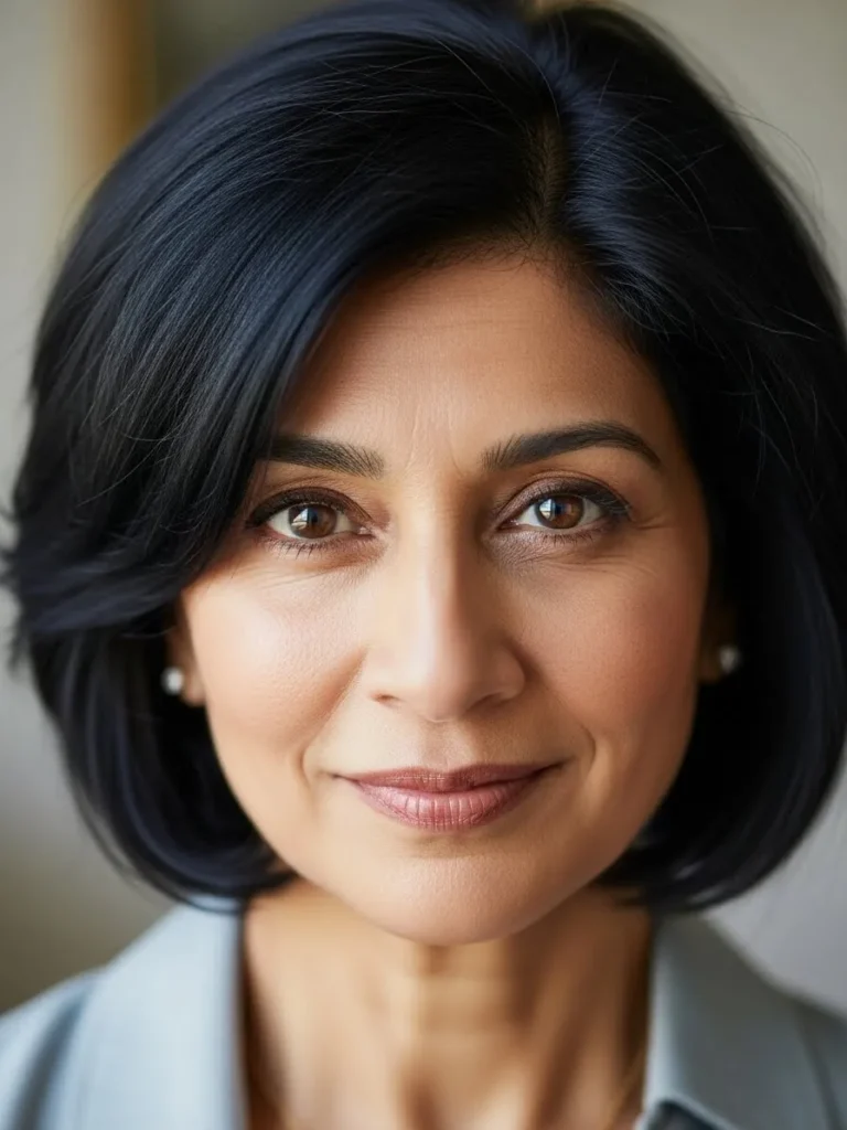 This smooth bob hits just above the shoulders with feathered ends that keep it soft instead of sharp. The deep midnight tone adds richness and shine while the light layering at the bottom creates movement. The middle part adds balance which helps the whole style look polished.