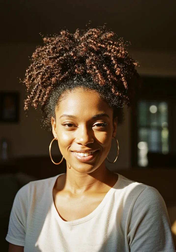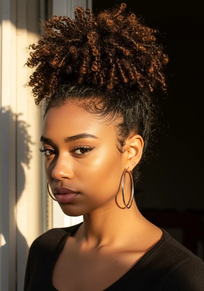 This look shows off a gorgeous high bun full of tight curls and bounce. The rich brown curls with copper undertones catch the light beautifully, and the height of the bun adds effortless drama. The natural texture and soft baby hairs at the front make the whole look feel fresh and real.