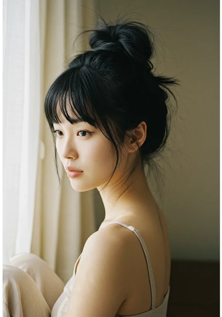 This hairstyle is light, airy, and full of personality. The deep black hair is styled into a messy high bun, with soft, feathery bangs framing the face. The loose strands and volume give it a dreamy, youthful look.