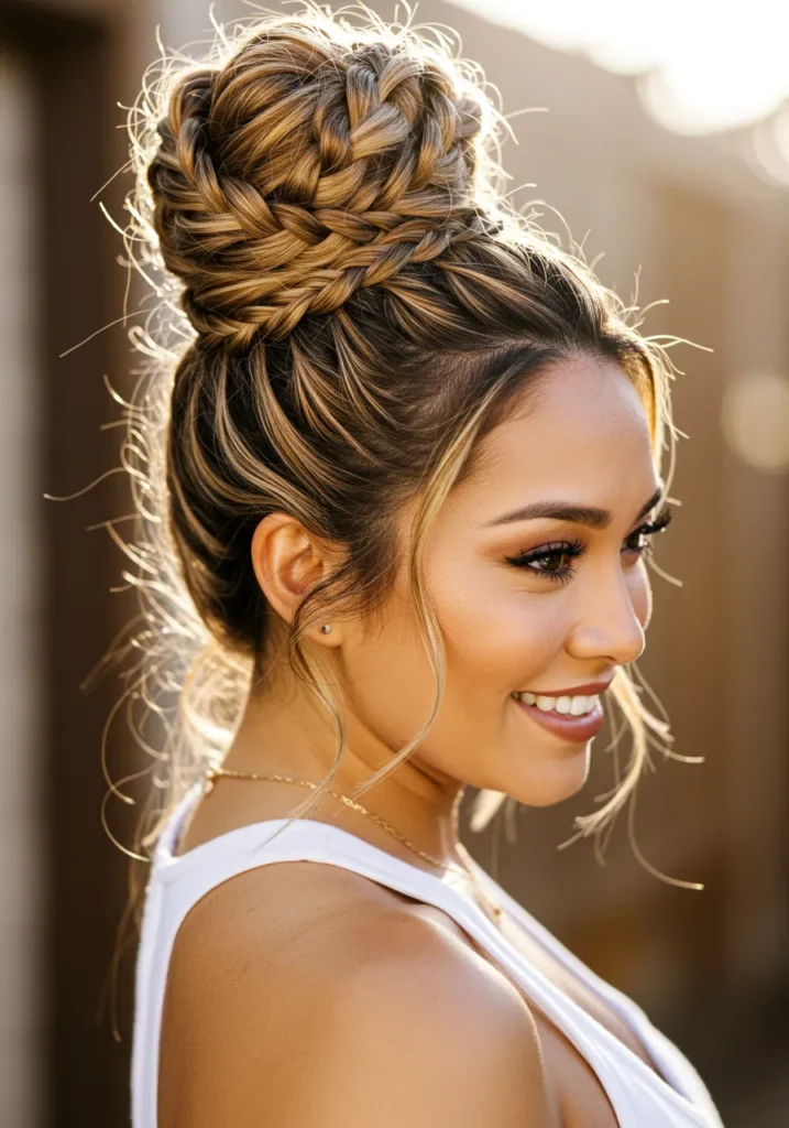 This look takes the classic bun and gives it a statement twist. The golden brown hair is intricately braided into a high bun, with layers of woven texture that create stunning dimension. Loose face-framing pieces add just the right touch of softness.