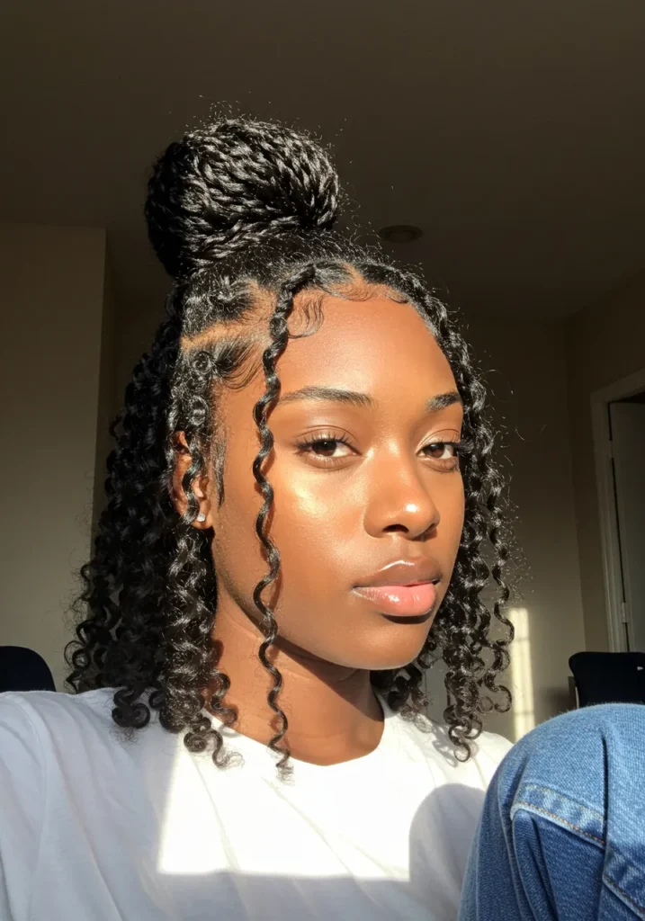 This hairstyle blends structure and volume perfectly. The natural curls are styled into a high half-bun, with the rest cascading freely down the shoulders. The coily texture and shine make it feel full of life and character.