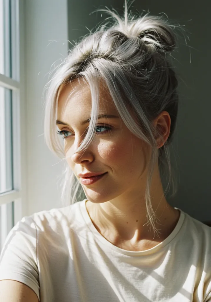 This bun has that effortlessly undone charm everyone loves. The icy platinum blonde hair is twisted into a loose bun, with soft strands falling freely around the face. The light catches the silvery tones beautifully, while the wispy texture keeps it casual and romantic.