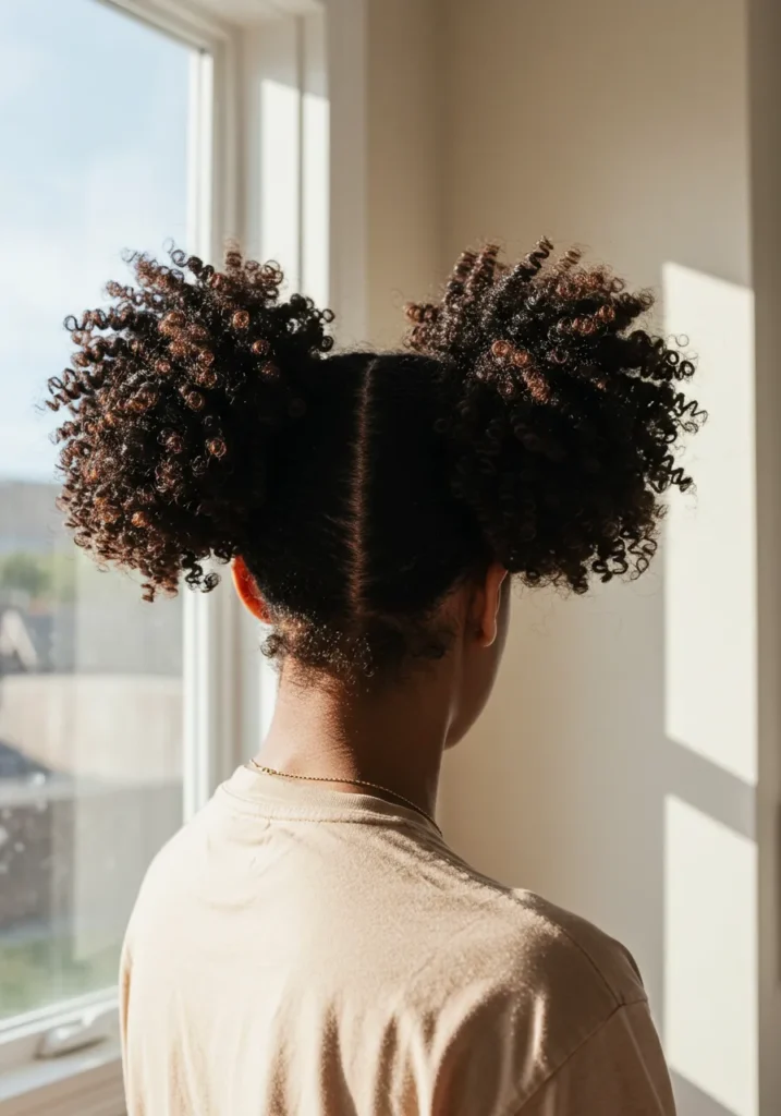 This hairstyle features two fluffy curly buns that sit on either side of the head, creating a fun and voluminous look. The natural curls are full of texture and bounce, and the middle part keeps the style balanced and structured.