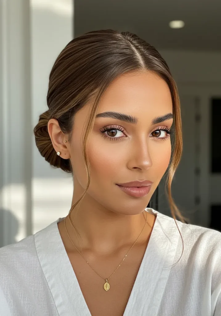 This bun is sleek, smooth, and simply gorgeous. The soft brown hair with warm caramel highlights is styled into a neat low bun, with a few tendrils left out to frame the face. It’s modern but still has that timeless charm.