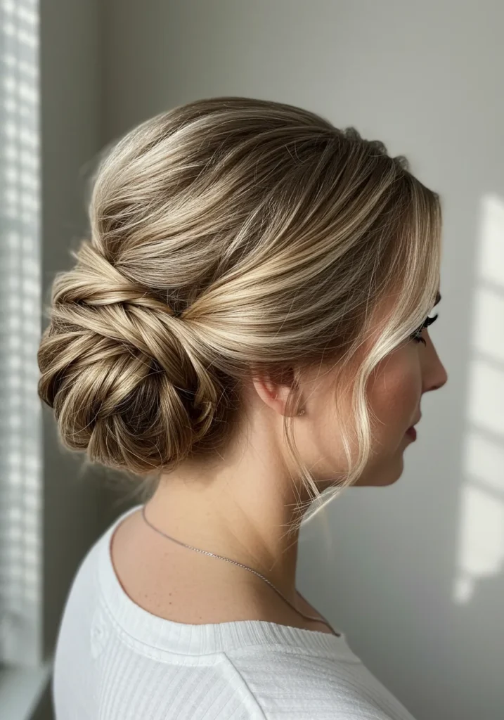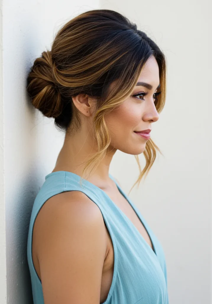 This bun is all about softness and movement. The light brown hair with honey highlights is swept back into a low bun with loose, curled strands that gently frame the face. The layers and texture add a romantic vibe that feels timeless.