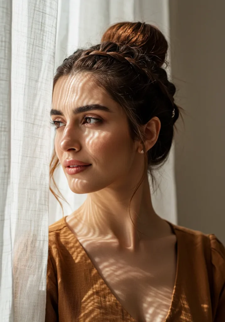 This hairstyle combines a high bun with a subtle braid woven across the crown. The dark brunette color glows in soft light, and a few loose tendrils around the face keep it from feeling too formal. It’s neat but still has that touch of whimsy I love.
