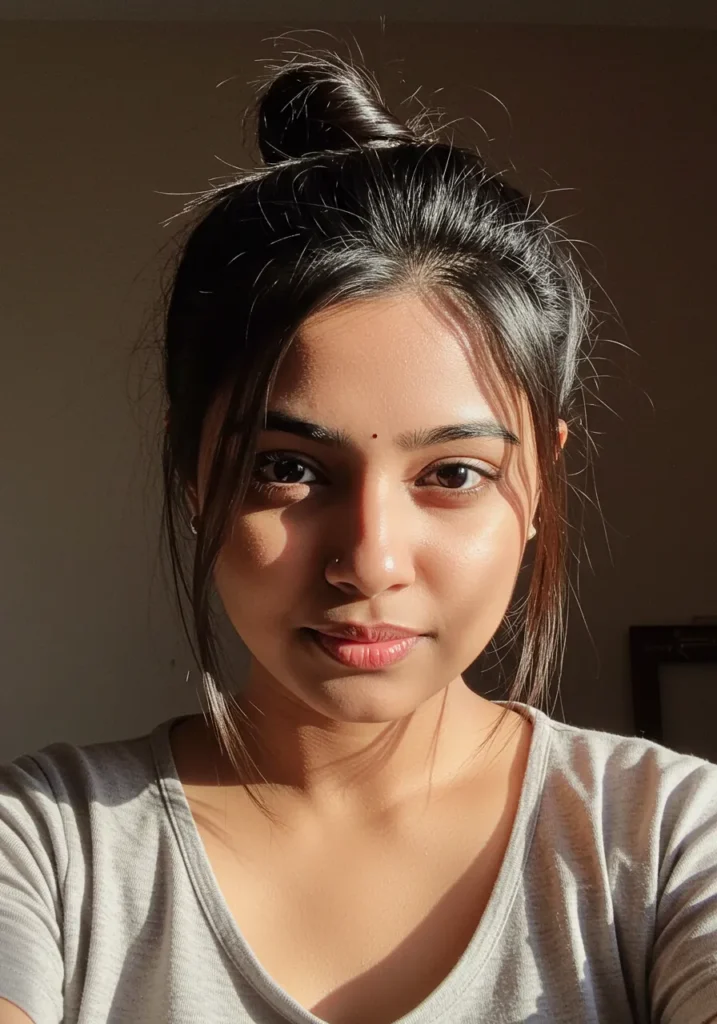 This hairstyle features a low, compact bun that sits neatly at the nape of the neck. The jet-black hair is perfectly smooth with a clean middle part, creating a balanced and simple look. The subtle texture and gentle shine make it feel polished without being fussy.