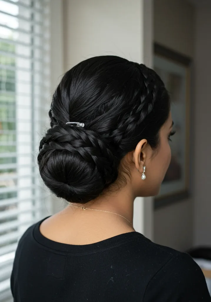 This style features a beautifully woven braided bun at the nape, crafted from silky black hair. The braids wrap elegantly into a rounded shape, accented by a small clip that adds a hint of sparkle. The sleek finish gives it a clean, sophisticated vibe.