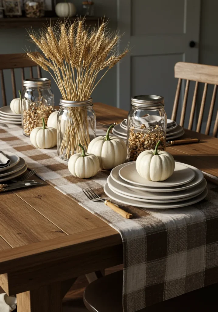 This setup leans into rustic warmth with a plaid table runner, stacked neutral plates, and mason jars filled with dried wheat and corn. Small white pumpkins are scattered throughout the arrangement, making the whole table feel playful yet grounded in tradition. The wooden chairs and natural textures give it that cozy farmhouse touch.