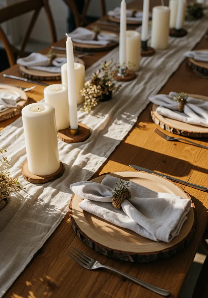 This design keeps it natural with wood-slice chargers, linen napkins, and a mix of pillar and taper candles lined up along a textured runner. Small sprigs of greenery tucked into the napkin rings bring a sweet organic touch.
