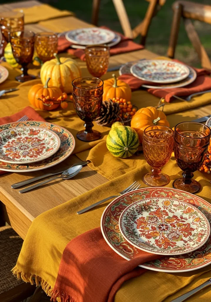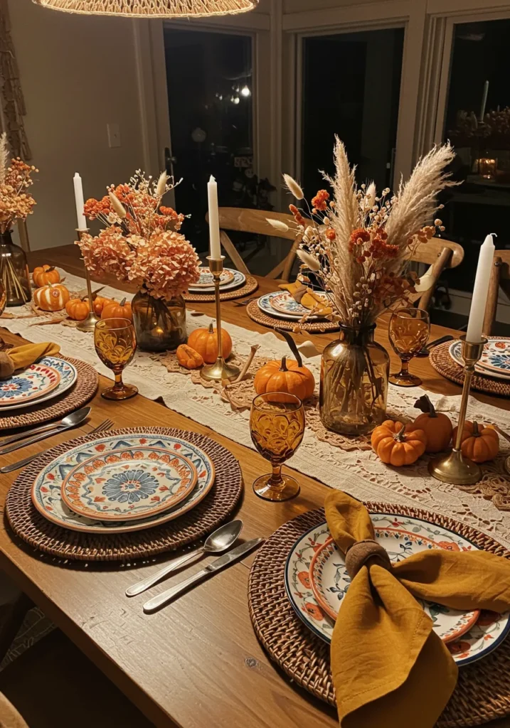This setup is rich with character thanks to patterned plates, woven chargers, amber glassware, and textured runners. Pampas grass and dried florals bring height to the centerpiece, while tiny pumpkins scattered across the table make it festive and playful.