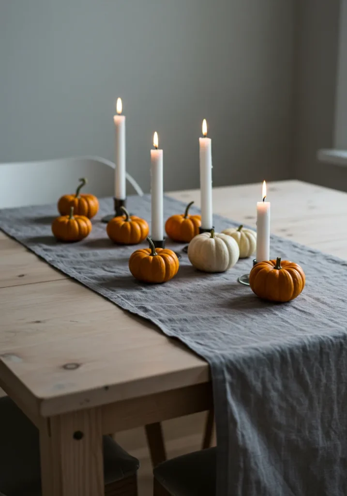 This pared-back design uses a linen runner as the base, with slim white candles and little pumpkins placed along its length. The natural wood table keeps the look airy and bright, while the minimal color palette makes it feel modern.