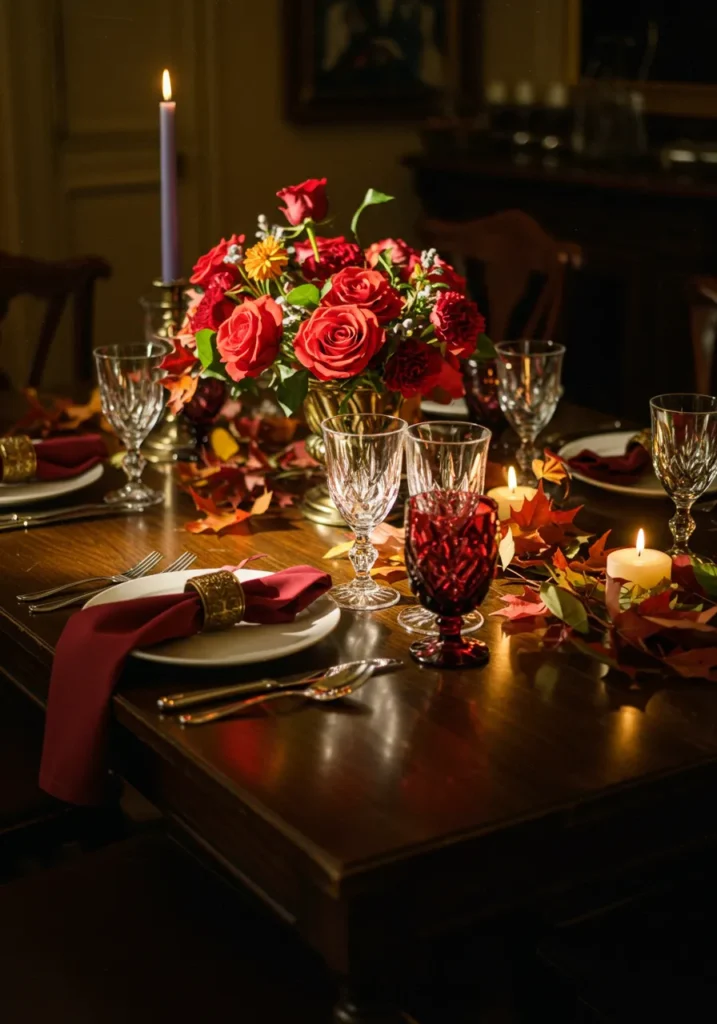 This table turns up the drama with rich red napkins, golden napkin rings, and a centerpiece overflowing with roses and autumn leaves. Crystal glasses sparkle in the candlelight, giving the whole space a luxurious glow.