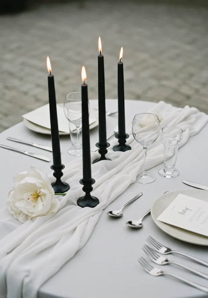 A round white table is styled with a soft draped runner, slim black taper candles, and crisp plates. A single white rose adds a delicate touch, while the minimal palette makes the whole look feel sophisticated and modern.