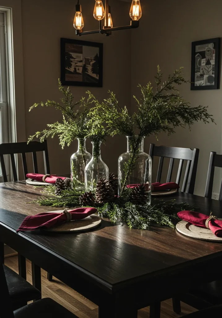 This table is all about natural holiday charm with vases of evergreen branches, pinecones scattered along the center, and rich burgundy napkins tied with twine. The mix of greenery and wood creates a grounded, festive look.