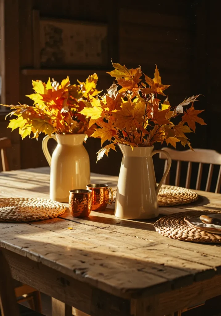 Rustic pitchers filled with golden autumn leaves take center stage on this wooden table. Copper mugs and woven placemats add texture, while the warm sunlight makes the colors practically glow.
