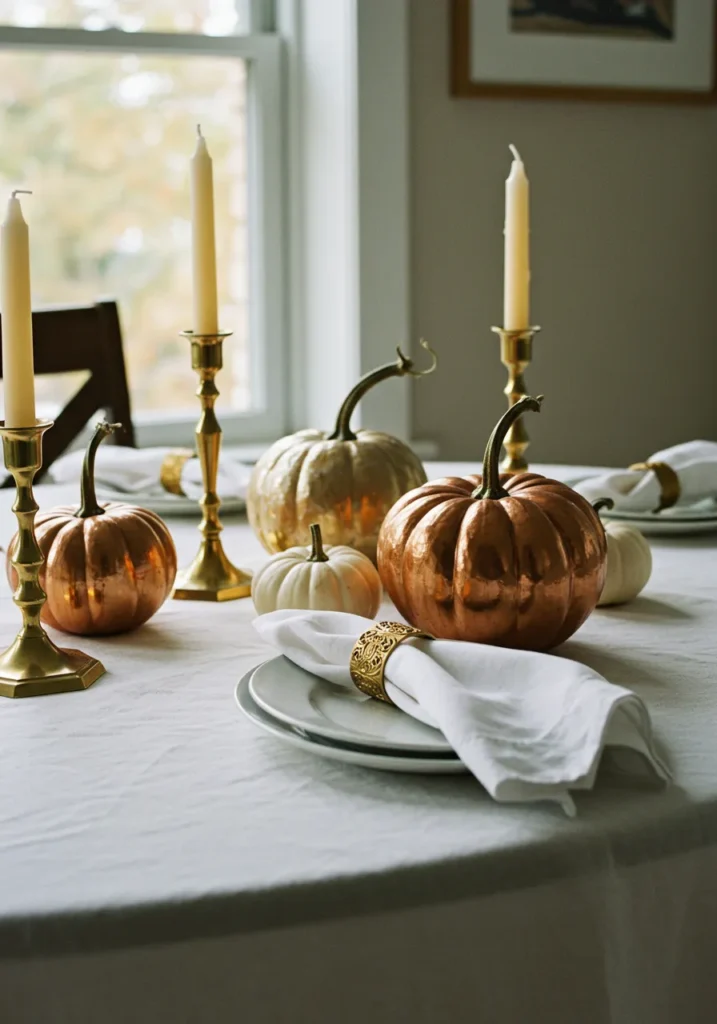 This table sparkles with metallic pumpkins in copper and gold, paired with brass candlesticks and crisp white linens. The shiny finishes add a festive glow, making the table feel glamorous yet playful.