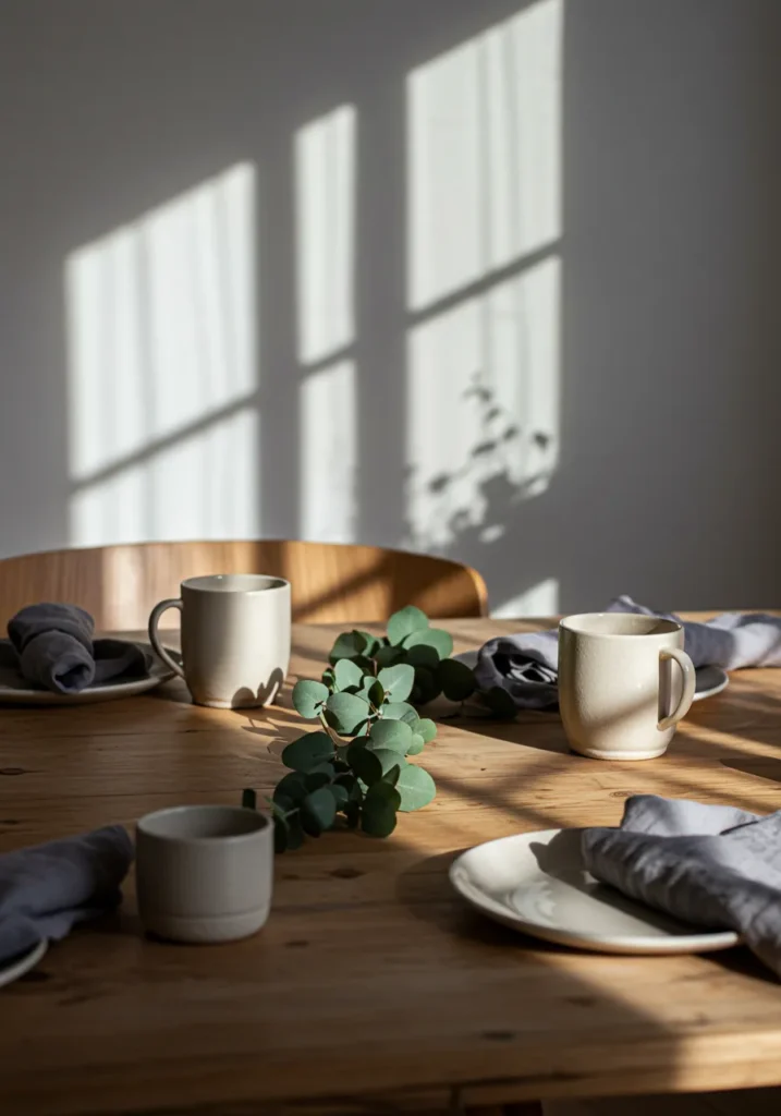 A simple wooden table is dressed with a single strand of eucalyptus running down the center. Neutral mugs and plates with folded napkins keep everything pared back, letting the natural light and greenery set the mood.