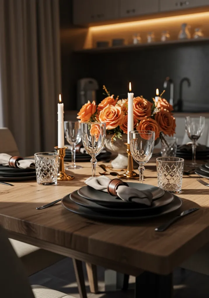 Here we have a modern take on Thanksgiving elegance. Black plates sit on a sleek wooden table, paired with taupe napkins tucked into leather rings. Crystal glasses sparkle under the soft glow of candlelight, while a lush centerpiece of orange roses brings the perfect autumn warmth.