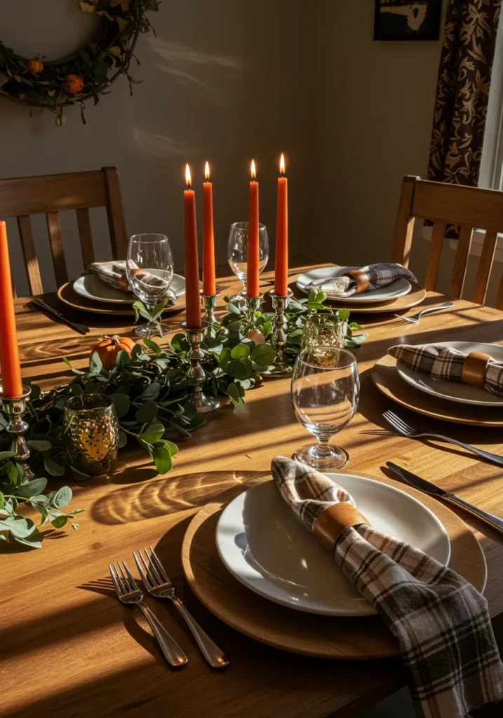 This table radiates warmth with tall burnt-orange taper candles, a lush green garland, and plaid napkins tucked into leather rings. The natural wood table adds richness, while the flicker of the candle flames makes the whole space feel cozy and inviting.