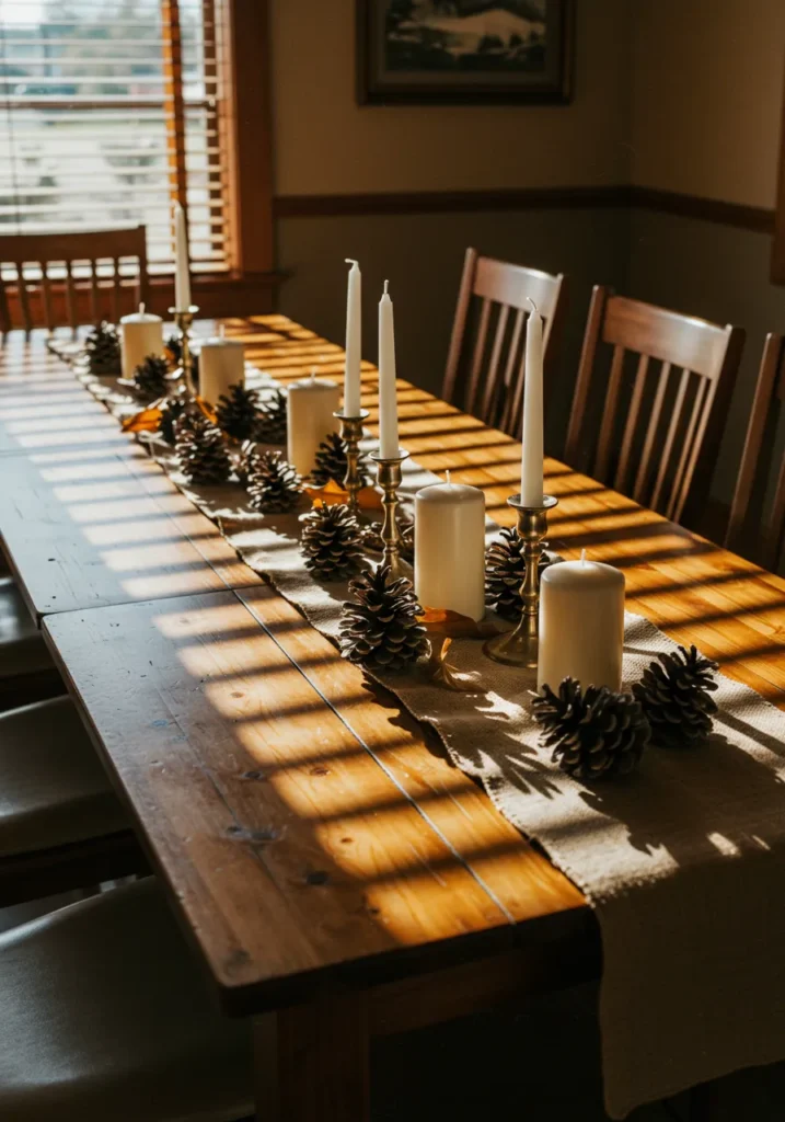 This table feels like the heart of a cabin Thanksgiving. A simple burlap runner stretches across the wood, dotted with pinecones and a mix of taper and pillar candles. The sunlight streaming through the blinds adds that perfect golden glow, making everything look even cozier.