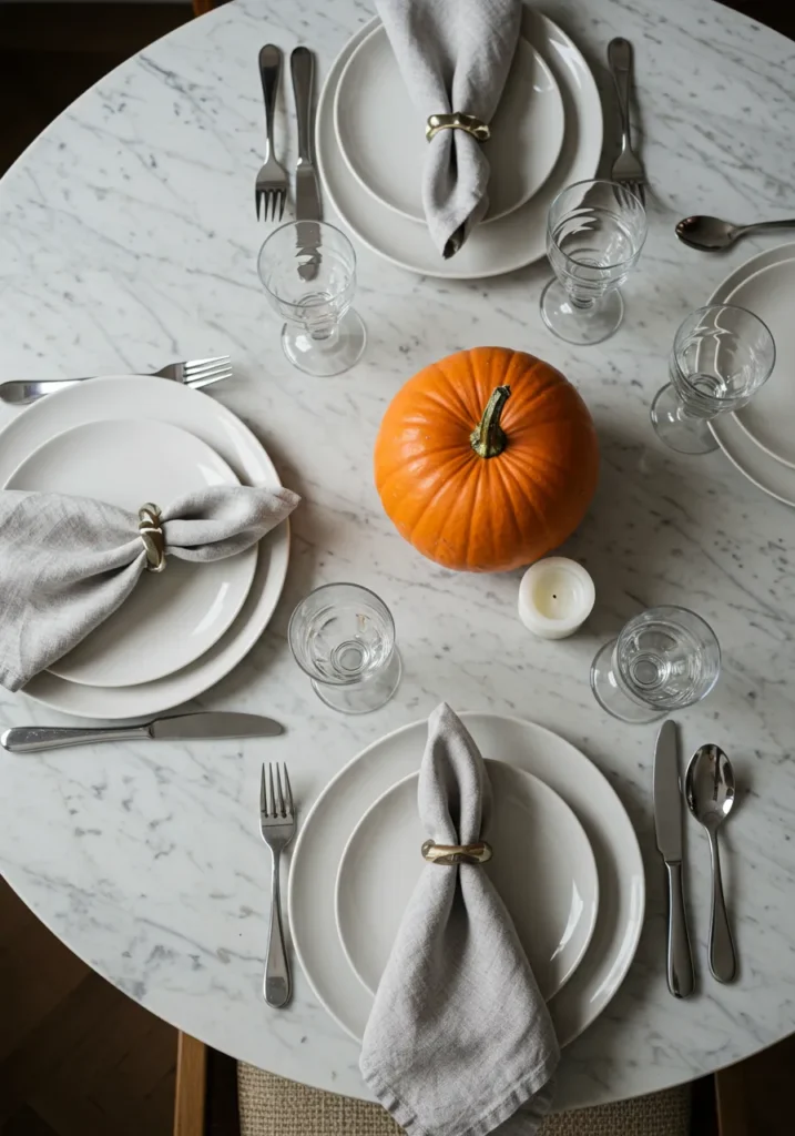 I find this setup so refreshing because it shows how less really can be more. That one pumpkin instantly gives the table a festive feel, and the marble background makes it feel extra polished. It’s proof you don’t need a dozen decorations to impress your guests.