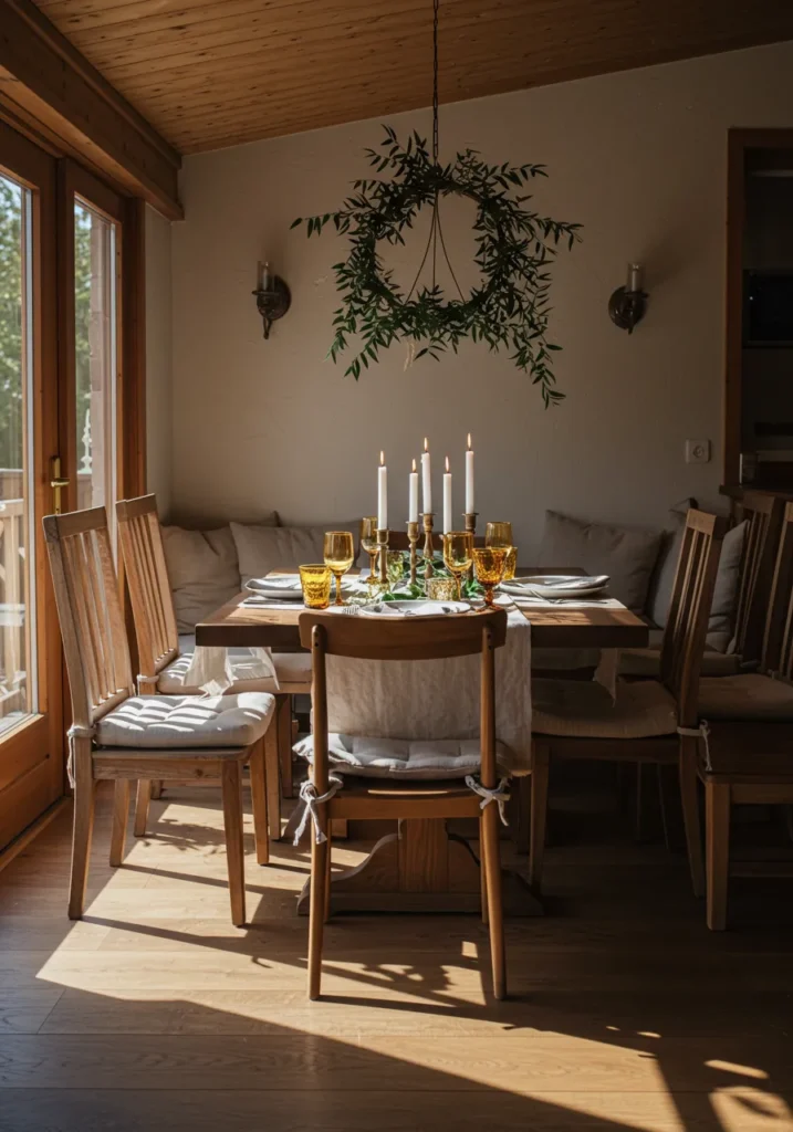 This dining space is all about natural wood tones and golden accents. The table is dressed with a simple linen runner, surrounded by amber glassware that adds richness. Tall candlesticks sit in the center, glowing warmly under a hanging wreath of greenery that ties the look together.