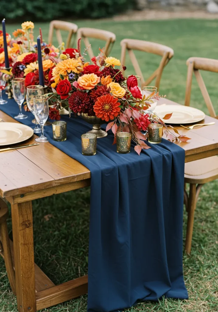 This outdoor table bursts with color thanks to a navy table runner and a vibrant centerpiece of dahlias, roses, and seasonal leaves. Gold-rimmed glasses and plates add a little shimmer, while votive candles tucked between the flowers make the whole setting feel magical.