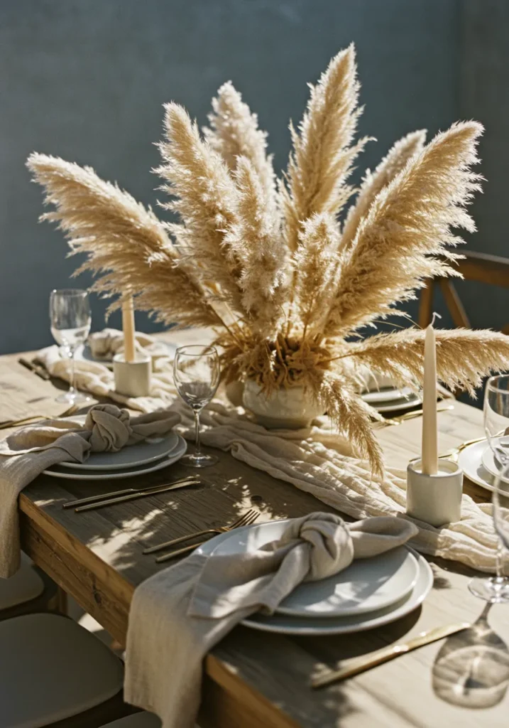 This table is all about soft textures and earthy tones. A simple wooden table is styled with a gauzy runner, knotted linen napkins, slim ivory candles, and a dramatic centerpiece of pampas grass that steals the show with its airy plumes. The neutral palette keeps it calm and elegant, while the mix of layers adds cozy dimension.