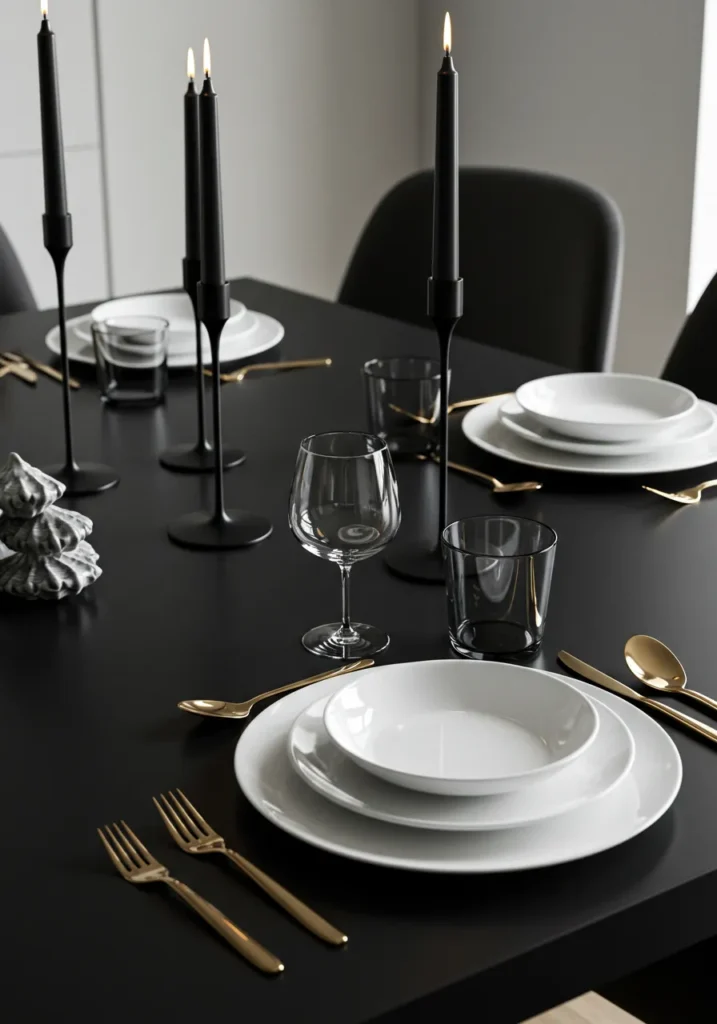 A bold black table sets the stage for this ultra-modern design. Crisp white plates sit on top of the matte surface, paired with tall black taper candles and elegant gold flatware. The look is striking and minimal, with every detail polished to perfection.