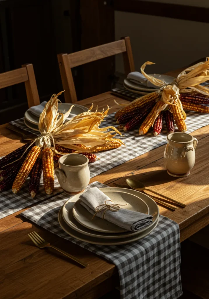 This farmhouse table celebrates the beauty of the harvest with bundles of colorful Indian corn tied in rustic twine. A gingham runner adds a homey layer, while neutral plates and simple mugs keep everything balanced. The golden sunlight streaming across the table makes the colors glow.