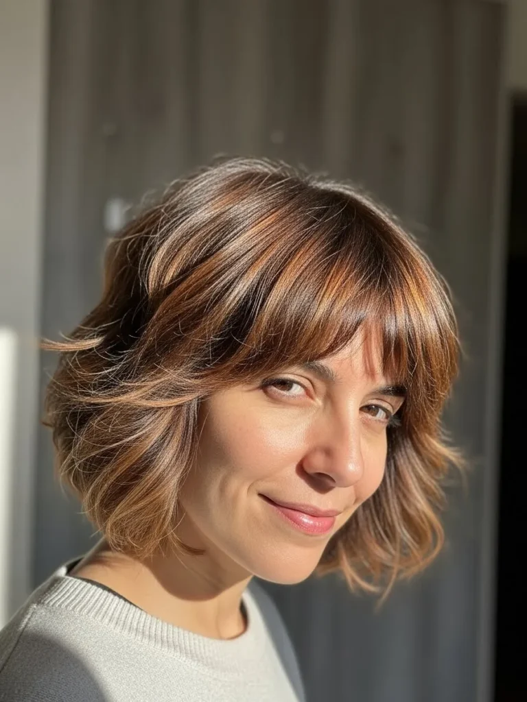 This chin length style has a choppy texture with airy layers and a soft piecey fringe that brightens the eyes. The warm brown shade with subtle golden tones adds natural dimension. The waves fall loosely which keeps the style casual and playful.