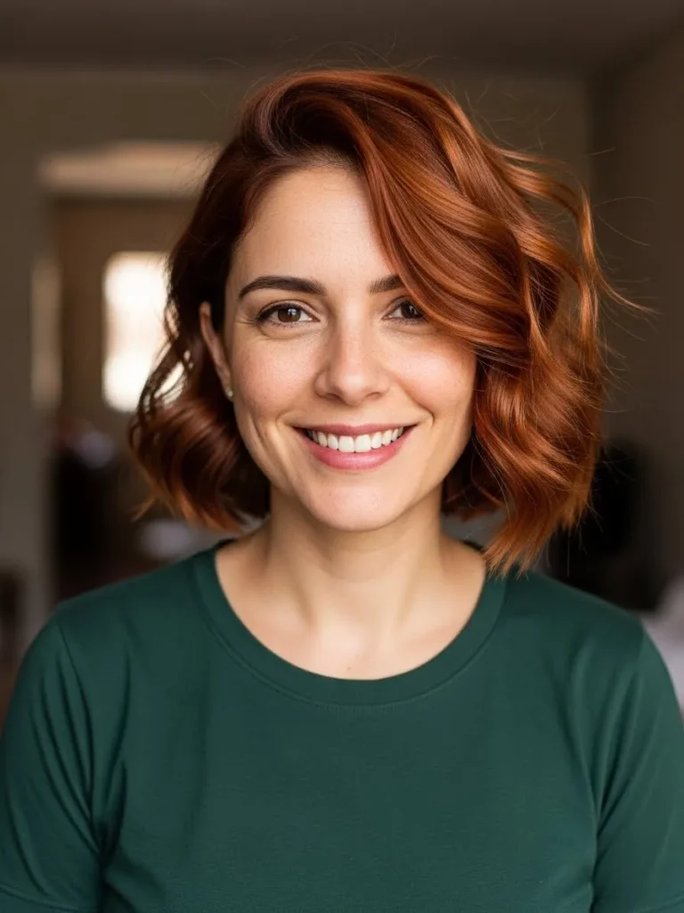 This chin length choppy bob has loose waves that add gentle volume and a warm copper tone that brightens the complexion instantly. The texture is soft and touchable and the layers fall in a natural curve that frames the cheeks beautifully. The color has a subtle glow that makes the whole cut feel lively.
