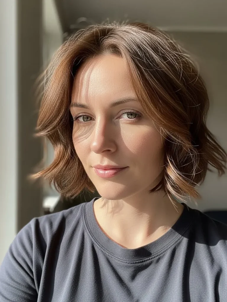 This chin length bob has soft airy waves that fall gently around the face and the chestnut brown shade adds warmth and brightness in the sunlight. The texture is loose and effortless and the layers curve in a way that softens the jawline. The natural shine lifts the whole look and gives the style a fresh glow.