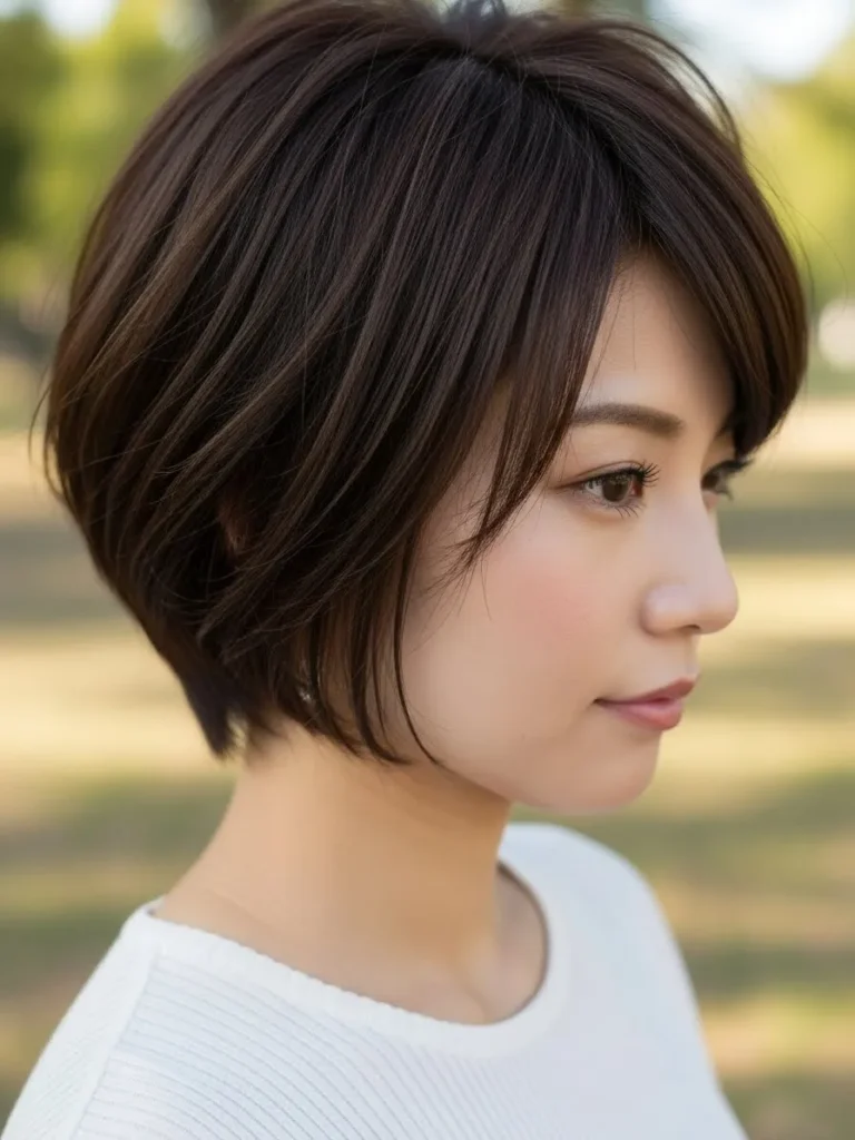 This chin length style has a rounded shape with fine airy layers that create a soft frame around the cheeks. The chocolate brown shade looks glossy and smooth and the ends flip slightly outward to give the cut a playful touch. The texture is subtle but still visible which keeps the bob from looking too structured.