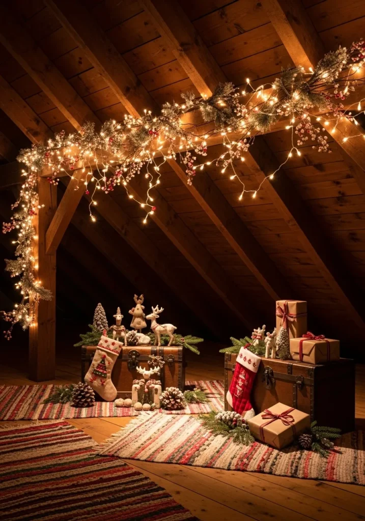 This charming attic nook feels like something straight out of a nostalgic Christmas movie. The slanted wooden beams are wrapped in warm fairy lights mixed with frosted greenery and little red berries that sparkle softly against the rustic wood ceiling. Below, vintage trunks are transformed into festive displays with stockings, pinecones, reindeer figurines, and neatly wrapped presents tied with red ribbons. The woven striped rugs add a cozy, handmade touch that makes the whole space feel welcoming and full of warmth.