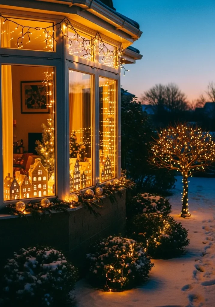 This charming home design captures the kind of Christmas magic that makes you stop and smile on a snowy evening. The bay window glows with layers of soft fairy lights that spill golden warmth into the frosty yard. Inside, a row of tiny illuminated paper houses creates a storybook village scene, while outside, twinkling lights trace the outlines of shrubs and a beautifully wrapped tree. The entire setup feels like a cozy postcard brought to life, with just the right balance of sparkle and serenity.