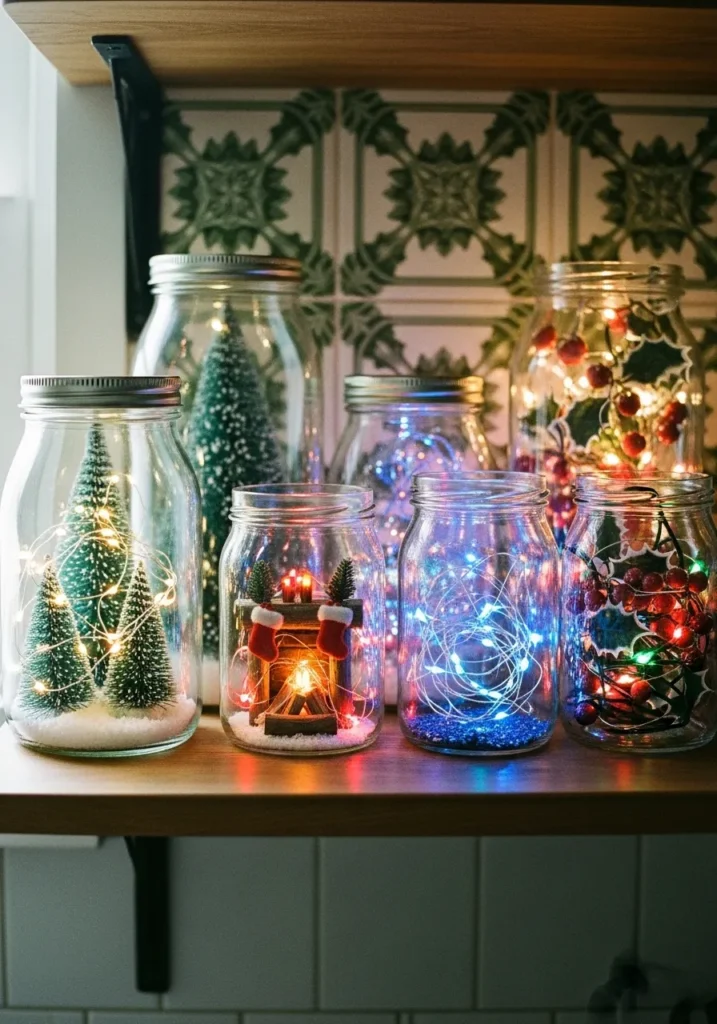 This charming display turns simple mason jars into glowing little Christmas worlds. Each jar holds its own tiny story, from snowy pine trees wrapped in warm fairy lights to holly berries sparkling against a tangle of copper wire lights. The mix of soft golden tones and cool blue hues creates a whimsical glow that looks just as lovely on a kitchen shelf as it does on a mantel. It’s the kind of cozy sparkle that feels handmade, heartfelt, and perfectly festive.