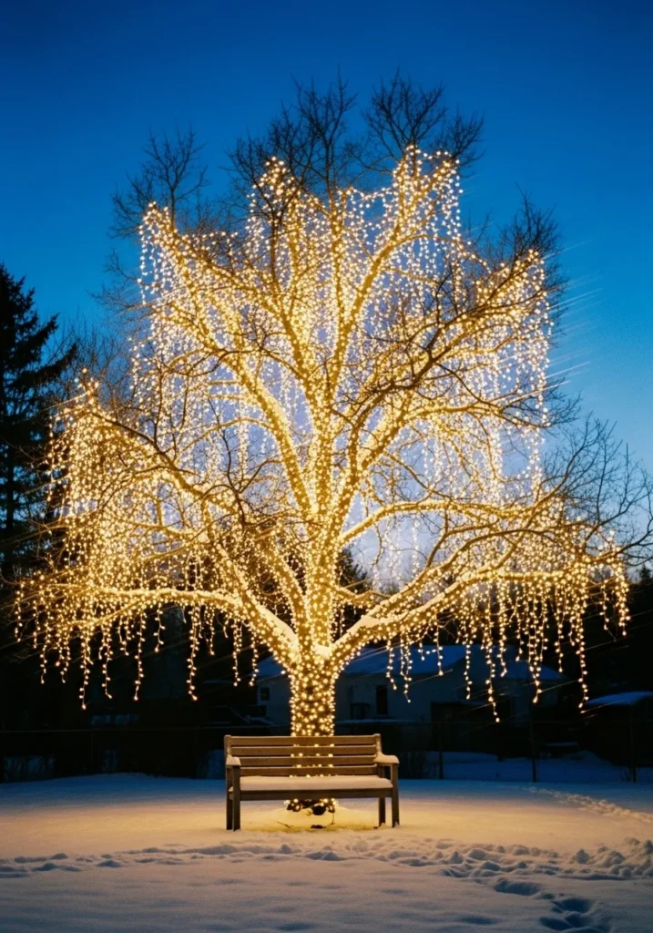 This breathtaking outdoor scene features a tall bare tree wrapped from trunk to tip in hundreds of golden fairy lights, creating the most magical winter glow against a blanket of snow. A simple wooden bench rests beneath the sparkling canopy, making it the perfect spot to pause and soak in the quiet beauty of a snowy evening. The lights cascade like shimmering icicles, transforming the cold landscape into something straight out of a Christmas fairytale.