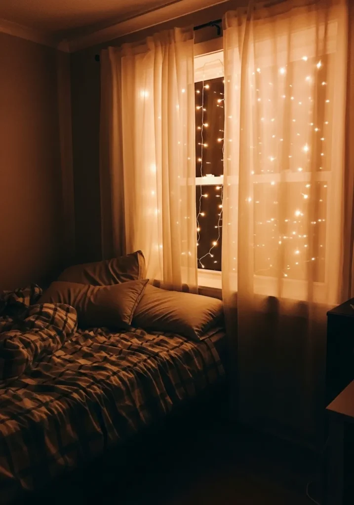 This cozy little bedroom looks like the perfect mix of warmth and simplicity. The soft fairy lights hanging behind sheer white curtains create a dreamy golden glow that wraps the whole room in comfort. The bed, with its plaid sheets and perfectly rumpled pillows, adds to that “I’ll just stay here five more minutes” kind of feeling. The lighting is gentle, the colors are warm, and the entire space feels like a safe little cocoon where winter nights feel endlessly calm.