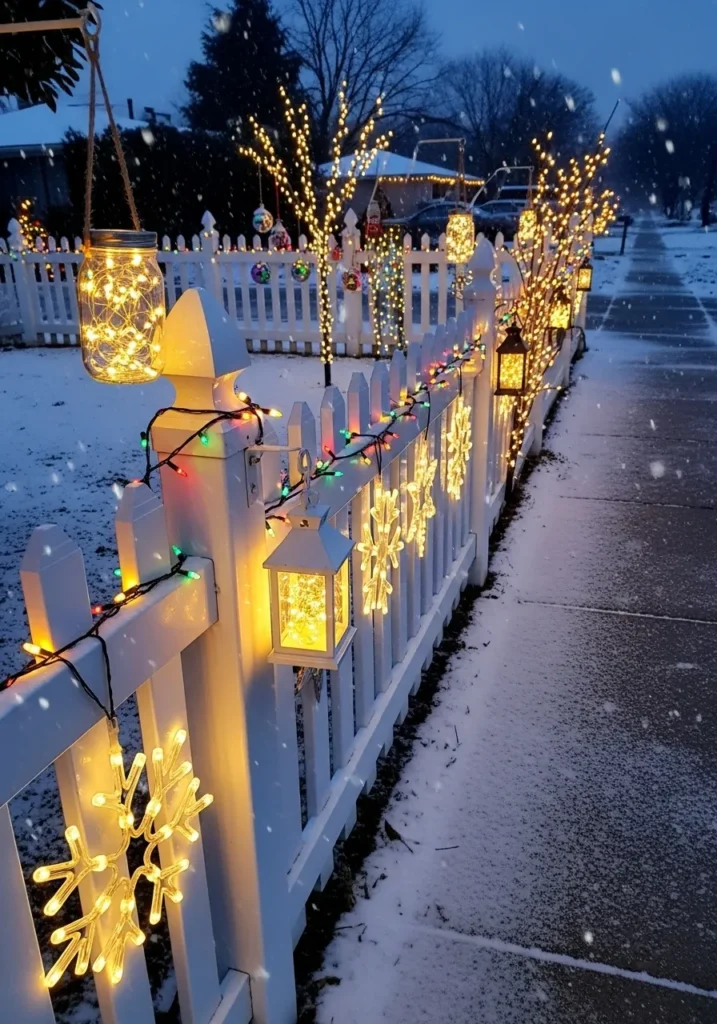 Snowy Fence Glow with Hanging Fairy Lanterns
